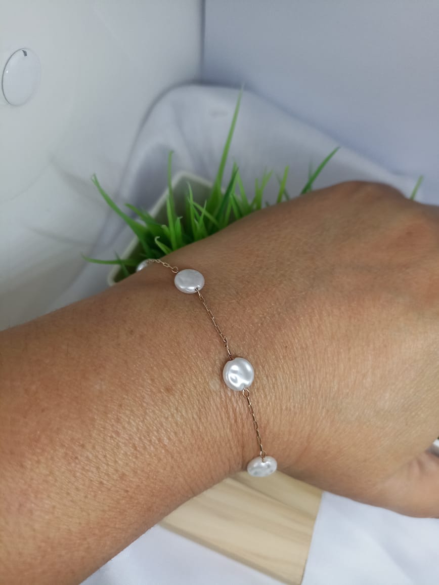 Pulseira elegante e atemporal, confeccionada com pérolas amassadas , que se destacam pelo formato irregular e charme natural. Cada pérola é única, trazendo um visual orgânico, sofisticado e cheio de personalidade.